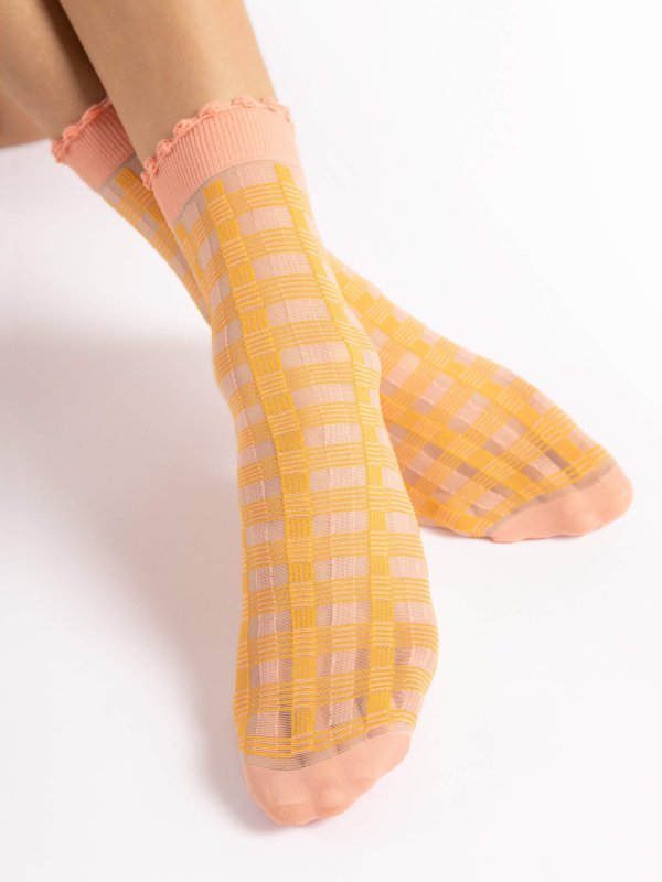 Sunny von Fiore bezaubert mit einem von der Sonne inspiriertem, quadratischem Muster. Diese bezaubernden seidigen Damenstrümpfe sind ein Sonnenschein in Deiner Garderobe. Das intensive, leuchtende Muster in dichten Karos, kombiniert mit einer angenehmen Picot - Wellenkante am Bündchen und dem matten, transparenten Stoff machen sie zu einem Styling-Hit. Die Söckchen sind in der Farbe Peach (Pfirsich) erhältlich. Sunny ist im Zehenbereich verstärkt und verfügt über ein bequemes Bündchen. Die Strümpfe sind aus Qualitätsgarn namhafter europäischer Garnhersteller gefertigt
