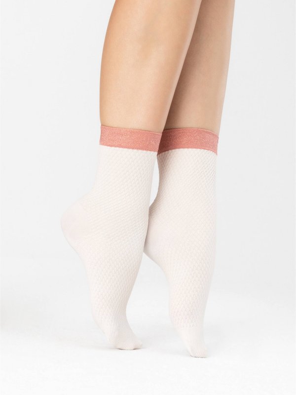 Bei Biscuit von Fiore kommt einem der Gedanke an Kekse und Waffeln in den Sinn. Hier erhältst Du hübsche und zarte Damensöckchen mit Waffelstruktur. Beide Modelle haben Ecru als Grundfarbe und die Büdchen sind in Pink/Roségold oder Beige mit Lurex gefertigt. 2 wunderschöne Modelle mit glänzendem Lurex in den Bündchen - eine fantastische Kombination. Diese Damenstrümpfe sind exquisit und wenn Du etwas Glitzer in Deinen Alltag bringen möchtest, ist dieses Modell eine sichere Wahl. Wir lieben diese Art von Glitzer!
