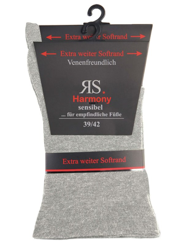 Harmony Diabetes Socken mit breitem und weichem Softrand. Besonders geeignet sind die Socken für Diabetiker und Menschen mit druckempfindlichen Füßen oder Knöcheln. Die Socken sind ohne einschnürendem elastischem Bund, mit einer handgenähten Zehenpartie und ohne spürbare Nähte gefertigt. Der Zehenbereich und die Ferse sind verstärkt. Hergestellt aus besonders feiner Garnqualität. Die Lieferung erfolgt als 2er-Pack in Silberfarben.