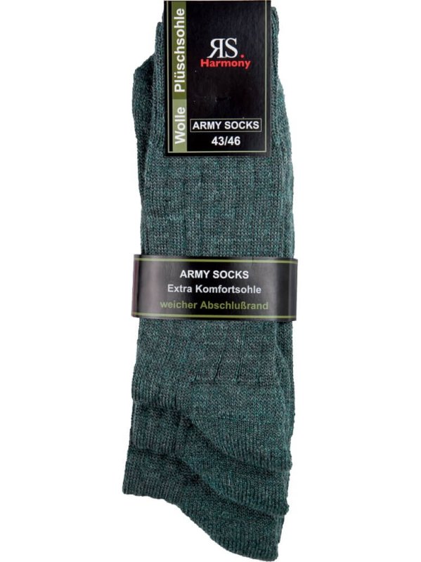 Super praktische und robuste RS. Harmony Strümpfe aus Wolle für Herren. Diese Army-Strümpfe haben eine dicke, bequeme, strapazierfähige Frotteesohle. Diese RS. Harmony Strümpfe passen sich Deinem Fuß perfekt an und halten ihn auf Deinen Ausflügen schön warm. Die Strümpfe sind sehr hochwertig verarbeitet und besonders langlebig.