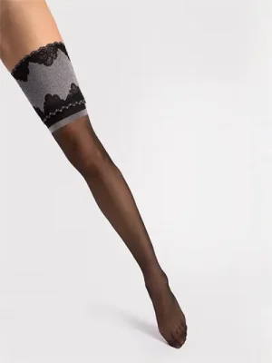 Belle Epoque von Fiore hat einen wunderschönes breites Band mit bezauberndem Muster in Silber. Belle Epoque ist raffiniert und das Silbermuster mit Lurex verleiht diesen Strümpfen einen besonders romantische Ausdruck. Belle Epoque sind der ideale Begleiter für einen romantischen Abend. Genieße diese besonders sinnlichen Stay Ups und verwöhne Dich selbst oder einen besonderen Menschen mit deren Zauber. Die Beine sind in klassischem Mattschwarz gehalten und der Zehenbereich ist unsichtbar verstärkt. Mit 3D-Technologie gefertigt. Das Qualitätsgarn sorgt für eine erhöhte Verschleißfestigkeit und garantiert eine weiche und glatte Struktur einen seidigen Effekt. Dieser Effekt sorgt für ein angenehmes Hautgefühl sowie die erhöhte Elastizität für eine perfekte Passform.