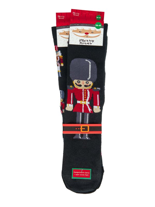 Wunderschöne Weihnachtssocken mit Nussknacker Motiv. Unisex Baumwollstrümpfe im coolen Weihnachtsstil. Dieses Modell ist perfekt geeignet, um in der Weihnachtszeit Weihnachtsspaß zu erleben oder einfach nur im Haus herumzualbern. Dieses fröhliche Modell ist mit kleinen Nussknackern und mit großen Nussknackern versehen, sowie mit einem handgenähten Zehenteil gefertigt. Diese Socken sind super bequem und weich zu tragen. Hier erhältst Du  einen kuscheligen Weihnachtsstrumpf mit Komfortrand, der die Weihnachtszeit zum Vergnügen macht.