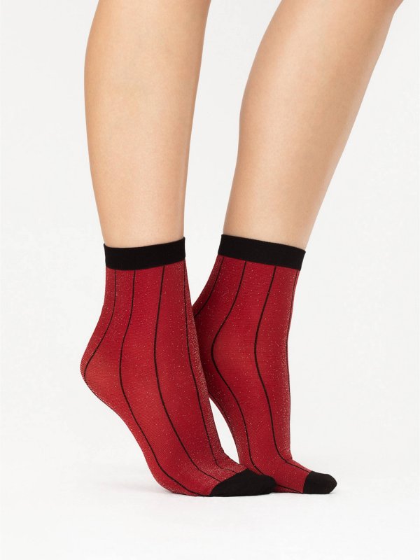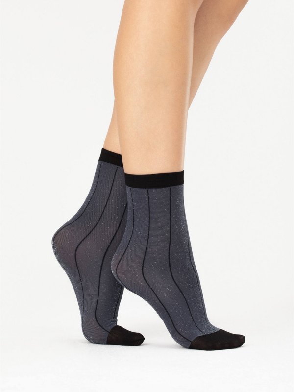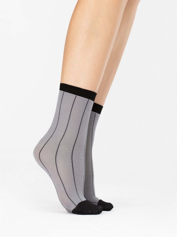 Mit Trinket von Fiore erhältst Du Damenstrümpfe mit hübschen Linien. 3 wunderschöne Farben plus schwarze Linien - eine fantastische, dynamische Kombination. Die Damensöckchen werden mit schmalen Linien gefertigt, die vom Bündchen bis zur Spitze verlaufen. Die Grundfarbe kontrastiert schön mit den schwarzen Linien auf einem Untergrund aus glänzendem Garn. Diese Damenstrümpfe sind exquisit und wenn Du einen glänzenden Auftritt wünschst, ist dieses Modell ein sicherer Gewinner. Wir lieben diese Art von Glitzer!