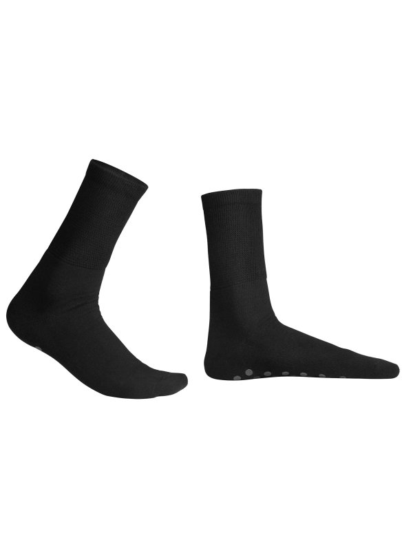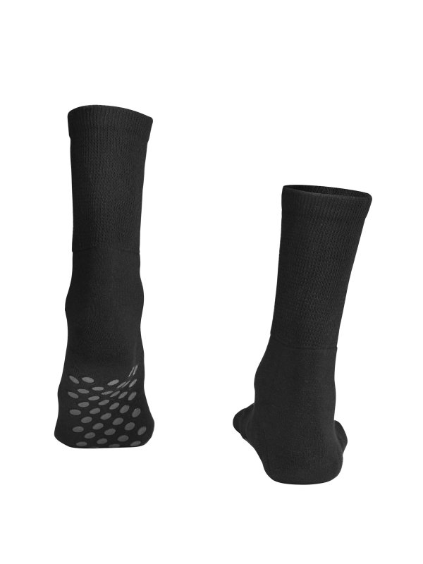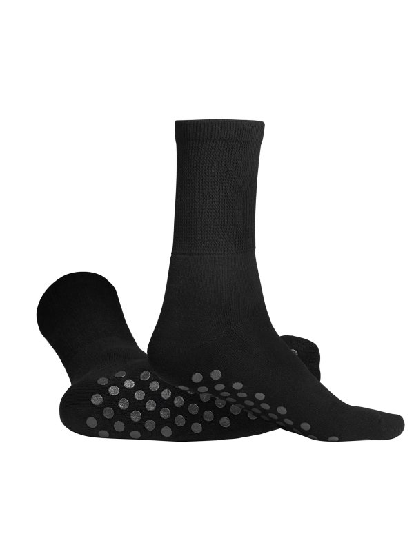 Hier erhältst Du hochwertige Diabetes- und Komfort-ABS-Socken (rutschfest) aus mercerisierter Baumwolle. Dieses Modell ist mit Silikonpads ausgestattet, die einen guten und sicheren Kontakt auch auf glatten Böden und Treppen ermöglichen. Die Socken haben eine Frotteesohle, einen weichen und bequemen Schaft und sind am Knöchel ohne Gummirand gefertigt. Die verwendete Baumwolle ist von hoher Qualität. Dies sorgt dafür, dass die Socken eine höhere Verschleißfestigkeit haben und beim Waschen weniger einlaufen als normale Baumwollsocken. Ein weiterer Pluspunkt ist, dass sie länger die ursprünglcihe Passform beibehalten. Die Socken sind mit Flachnähten im Zehenbereich gefertigt, was für optimalen Tragekomfort sorgt. Den Knöchel schließt ein breiter, weicher Rand ab, der für einen hohen Tragekomfort sorgt. Die Socken sind für Diabetiker geeignet.