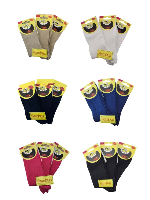 Schöne Unisex Kinder Bambussocken mit 75 % Bambusviskose. Das Modell ist in 6 klassischen Farben erhältlich. Bambus leitet Feuchtigkeit effektiv von den Füßen ab und macht die Socke atmungsaktiv. Somit hast Du stets trockene und warme Füße. Perfekt für aktive Kinder. Handgenähter Zehenbereich. Keine auffälligen Nähte. Der Zehenbereich und die Ferse sind verstärkt. Lieferung als 3er-Pack in den Farben Beige, Weiß, Jeans, Navy, Pink und Schwarz. Bambussocken sind unglaublich bequem und weich zu tragen.